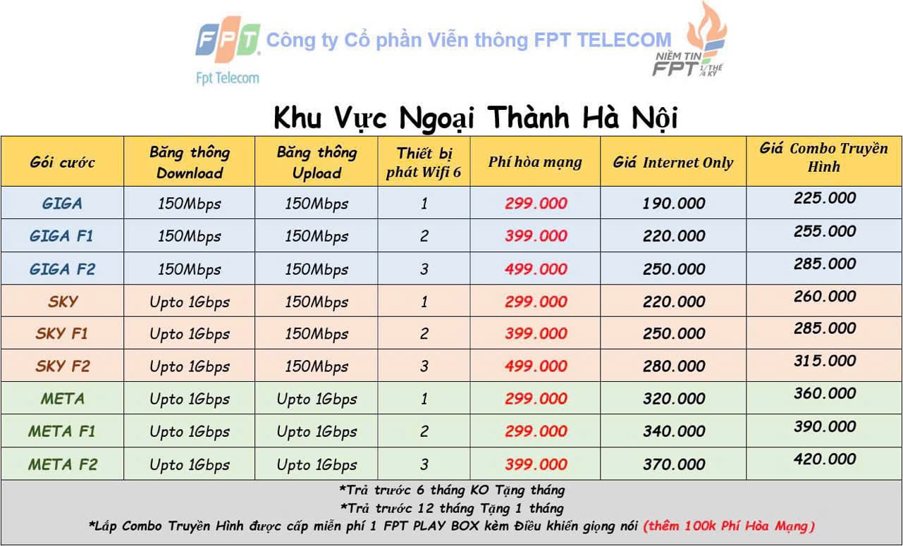 Lưu ý: Bảng giá có thể thay đổi theo khu vực ,thời điểm, theo các chương trình khuyến mãi khác nhau. Quý khách hàng muốn lắp mạng FPT vui lòng liên hệ số Hotline bên dưới để được nhân viên tư vấn các gói cước phù hợp nhu cầu với giá ưu đãi đặc biệt nhất.
